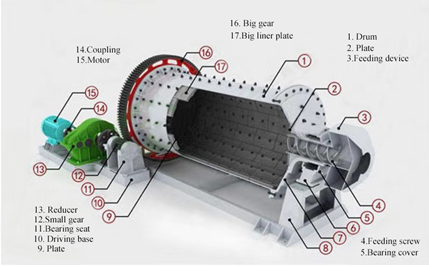 球磨機(jī)的基本原理是利用傳動(dòng)機(jī)械帶動(dòng)筒體旋轉(zhuǎn),物料從給礦處給入,在離心力的作用下,使筒體內(nèi)鋼球、物料與襯板之間發(fā)生撞擊、磨剝、摩擦等作功,完成物料磨粉作業(yè)。